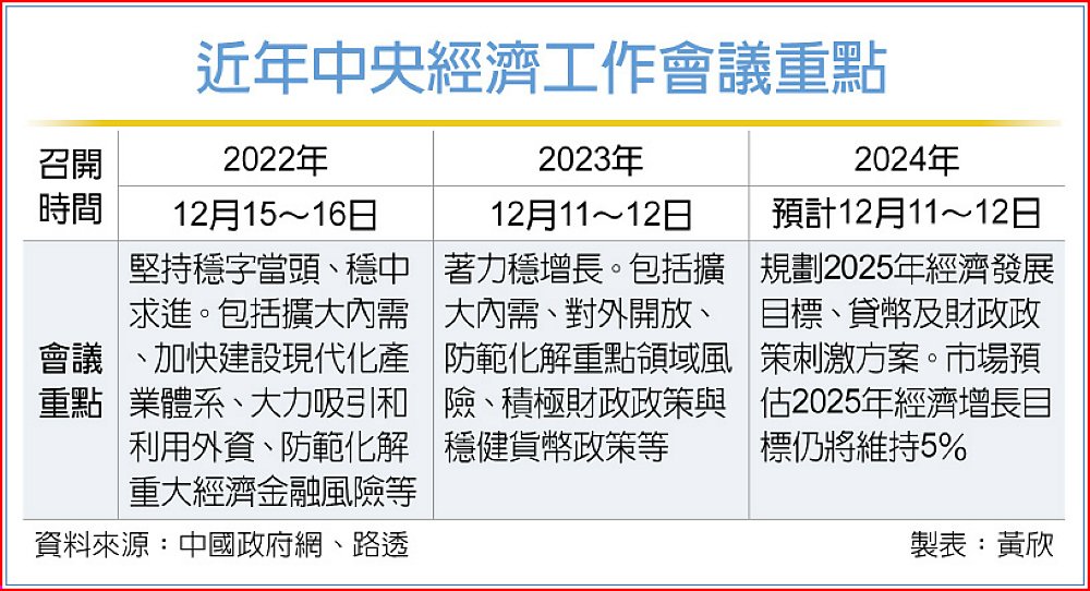 美媒消息指出,備受矚目的中共中央經濟工作會議將於12月11日舉行,將一連兩日,主要規劃2025年經濟發展目標、貨幣及財政政策刺激計畫等,會後大陸將透過官方媒體釋出會議相關結果的訊息。