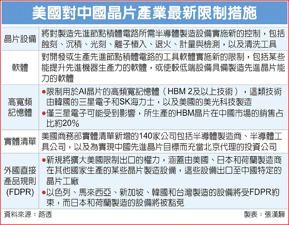 新措施的另一個重點是,限制用於AI晶片的HBM,這類技術由韓國的三星電子和SK海力士,以及美國的美光科技製造。業界人士認為,僅三星電子可能受到影響,其生產的HBM晶片在中國市場的銷售占比約20%。