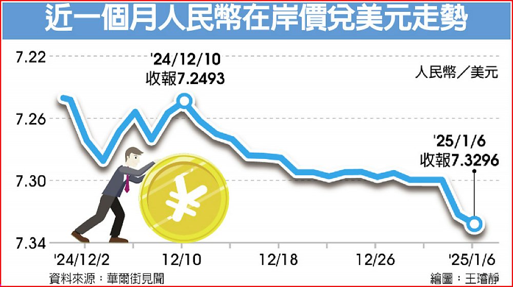 因應川普上任後的局勢,人民幣走勢成重要觀察指標,延續上周五以來的急跌趨勢,人民幣兌美元在岸價6日跌破7.33元,創下16個月新低。中國人民銀行6日透過主管金融時報向市場喊話,強調近日人行貨幣政策2024年第四季例會上強調「三個堅決」釋出穩匯決心,未來還有諸多工具可以使用。