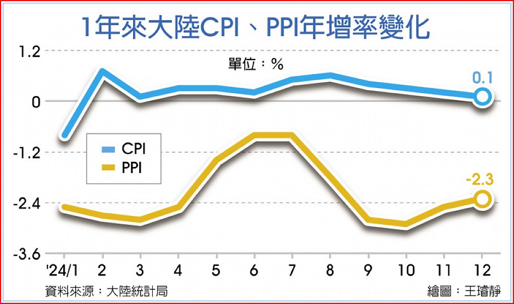 另外,大陸12月生產者物價指數(PPI)年減2.3%,為連續27個月收縮,但跌幅較11月收窄0.2個百分點。全年PPI年減2.2%,為連續第二年下跌,但跌幅較2023年收窄0.8個百分點。