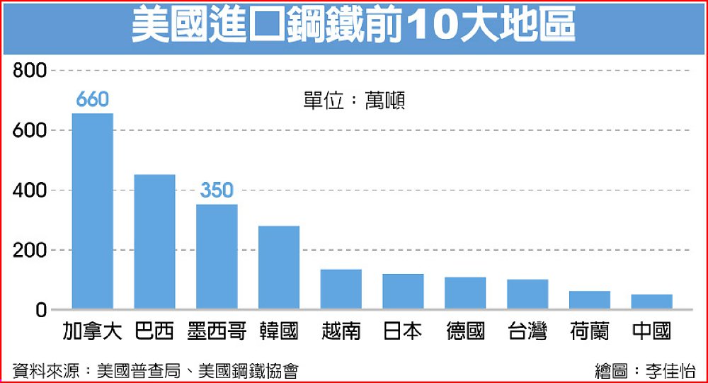 據美國政府和美國鋼鐵協會資料,美國約有四分之一的鋼鐵源自進口,進口最大來源國為加拿大、巴西與墨西哥,其次是韓國與越南,台灣為第八大進口來源國,中國大陸位居第十。