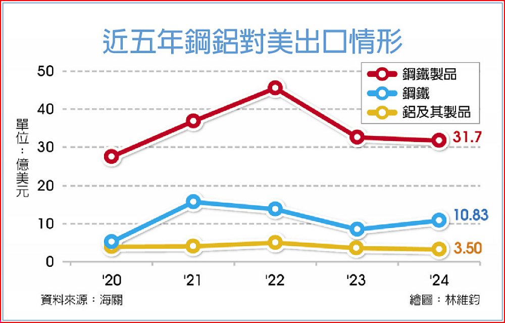 根據台灣海關資料,去年出口到美國的鋼鐵、鋼鐵製品、鋁及其製品,分別為11億美元、32億美元、3億美元,合計約46億美元,占整體鋼鋁出口180億美元約四分之一強。不過財政部表示,實際受影響情形,仍要觀察美國最後實際實施加徵關稅的品項才能評估。
