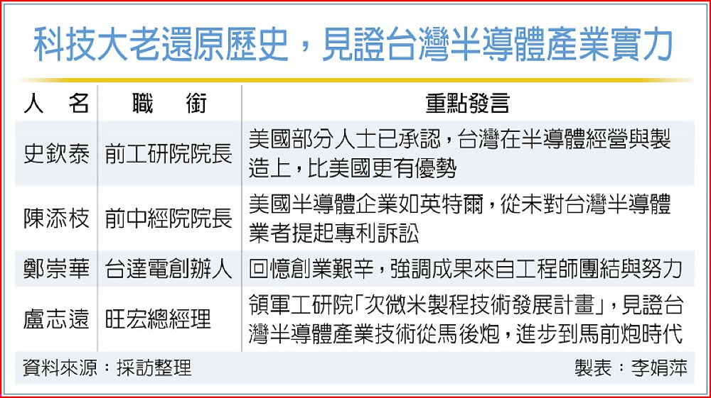 史欽泰、前中華經濟研究院院長陳添枝、台達電創辦人鄭崇華、旺宏總經理盧志遠等人,以見證人身份表示,台灣靠的是政府支持、產業生態系與工程師的累積努力,「台灣沒有偷美國晶片技術!」史欽泰與陳添枝指出,台灣半導體產業的起步沒有抄襲,而是透過合法技術購買與國際合作。