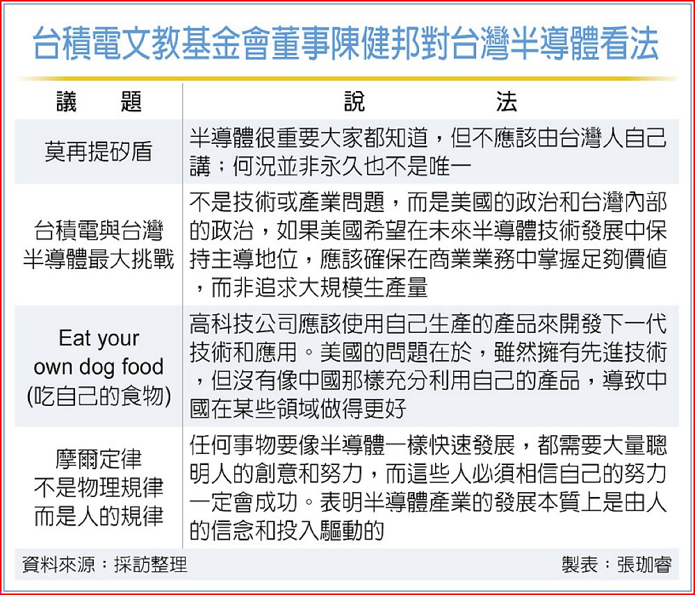 陳健邦強調,他不代表台積電。對於矽盾,台灣人最好不要自己講,因為半導體對國家安全很重要、有他的角色,他更以烏克蘭引以為戒。他強調,美國如果希望在未來半導體技術的發展中保持主導地位,是必須確保在商業中掌握足夠價值,而非掌握大規模的生產量。