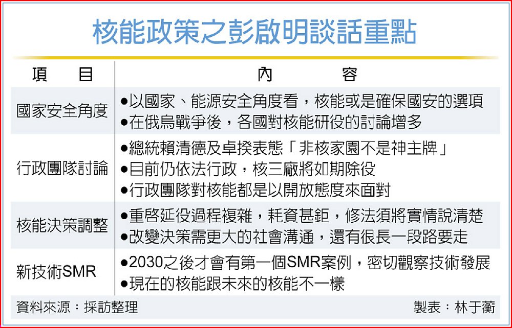 彭啟明表示,環境部不是核能主管機關,但會關注各種能讓減碳更有效率的項目,核能是選項之一。他還說,「核能或許是確保國家安全的選項」,但強調「沒有個人意見」,全世界在俄烏戰爭後,各國對於核能延役的討論確有增多的趨勢。