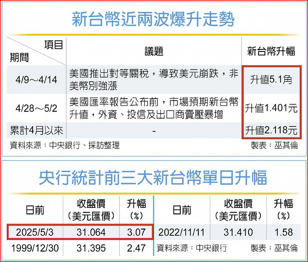 整個4月,新台幣累計大漲1.165元或3.64%,創下2023年12月以來、逾一年五個月的單月最大升幅,在主要亞幣中僅次於日圓。且進入5月漲勢更驚人,2日盤中連續升破32、31元兩大整數,最終勉強撐在31元上方,單日強彈9.53角或3.07%作收,創下央行有統計以來最大單日升幅。僅用一天時間,就幾乎追上4月全月升幅,線圖所呈現情況來看,新台幣走勢幾乎呈現90度直墜,不少外匯交易員直言,最近新台幣單日升2~3角,都不算多。