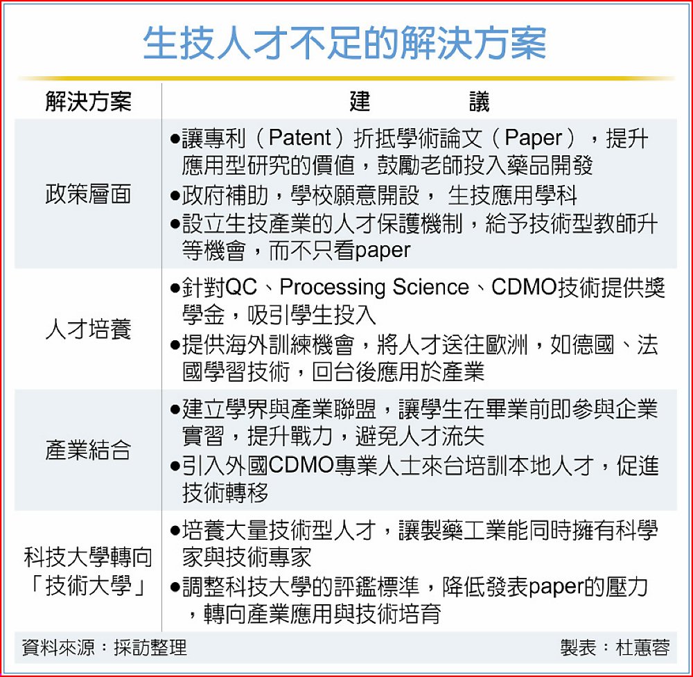 答:要有更多產學合作的機制,讓學生在學期間就能參與真實的製藥、QC(品質管制)、CDMO(委託開發與製造)工作,不只是待在實驗室做學術研究。政府也可以設立「生技人才保留計畫」,提供技術型獎學金,讓人才不要被挖角去半導體或出走國外。