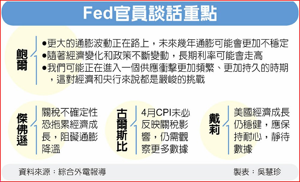 多位Fed官員發言也主張,耐心觀察後續數據釐清經濟走勢。Fed副主席傑佛遜(Philip Jefferson)示警,關稅相關不確定性恐拖累經濟成長,阻礙通膨降溫,他14日在紐約聯準銀行舉辦的活動指出,美國4月消費者物價指數(CPI)雖低於預期,但未來通膨路徑充斥不確定性,若迄今宣布的加徵關稅措施持續下去,可能打斷通膨降溫進展,至少讓通膨暫時性升溫。 關稅是否給通膨帶來升溫壓力,端看貿易政策實施程度、企業成本轉嫁給消費者、供應鏈反應及經濟表現。當前政策利率維持在4.25%和4.5%區間,這個水位仍具「適度限制性」,足以應對經濟情勢變化。