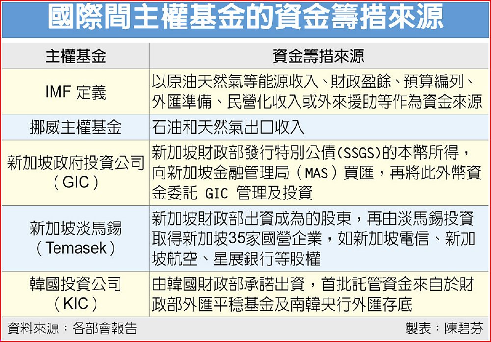 高仙桂說,新加坡主權財富基金新加坡政府投資公司(GIC)、韓國主權財富基金韓國投資公司(KIC)都是政院參考的方向,籌資部分為能對外匯存底提供有償給付,參考GIC作法,即新加坡財部發行星幣特別公債。目前行政院討論的發行公債模式,以能產生自償性收入為優先。
