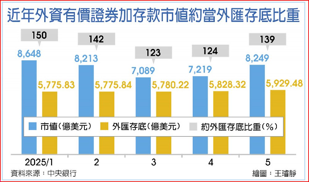 央行外匯局長蔡烱民說明,5月外匯存底上升,首先因當月孳息收入挹注;其次是主要貨幣對美元匯率變動,5月美元續跌,非美貨幣升貶互見,以非美貨幣持有的外匯折成美元後互抵,但仍然對外匯存底仍帶來正貢獻;其三最關鍵的是新台幣5月強漲6.91%,央行大舉進場買匯阻升。