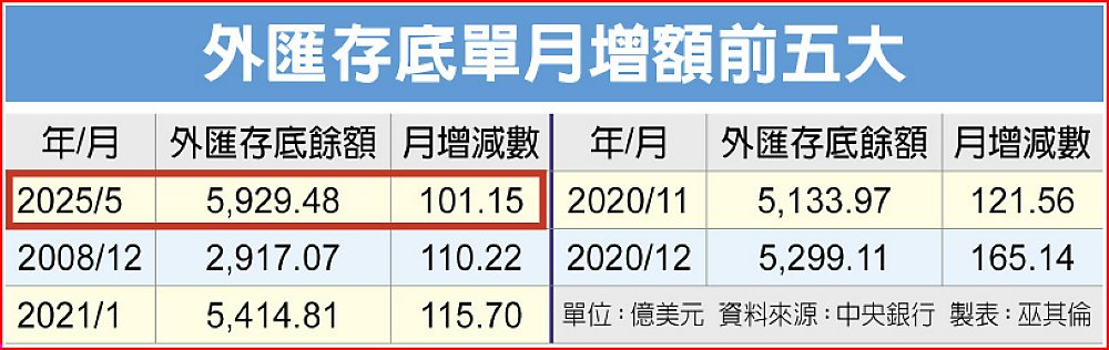 回顧央行外匯存底餘額,過去多次單月暴增百億美元規模,尤其2020年11月起至隔年1月,一度連續三個月均增逾百億美元,2020年12月狂增165.14億美元,為史上最大單月增幅,今年5月增加101.16億美元,排名史上第五。