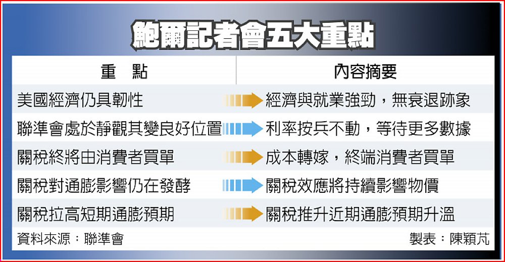 針對眾所關注的關稅和通膨關係,鮑爾在記者會表示,關稅最終將以某種形式轉嫁給消費者。他表示:「我認識的所有人都預測,在未來幾個月關稅會引發通膨明顯上升,因為關稅總得有人買單。從製造商、出口商、進口商到零售商,最終一定是消費者買單。」