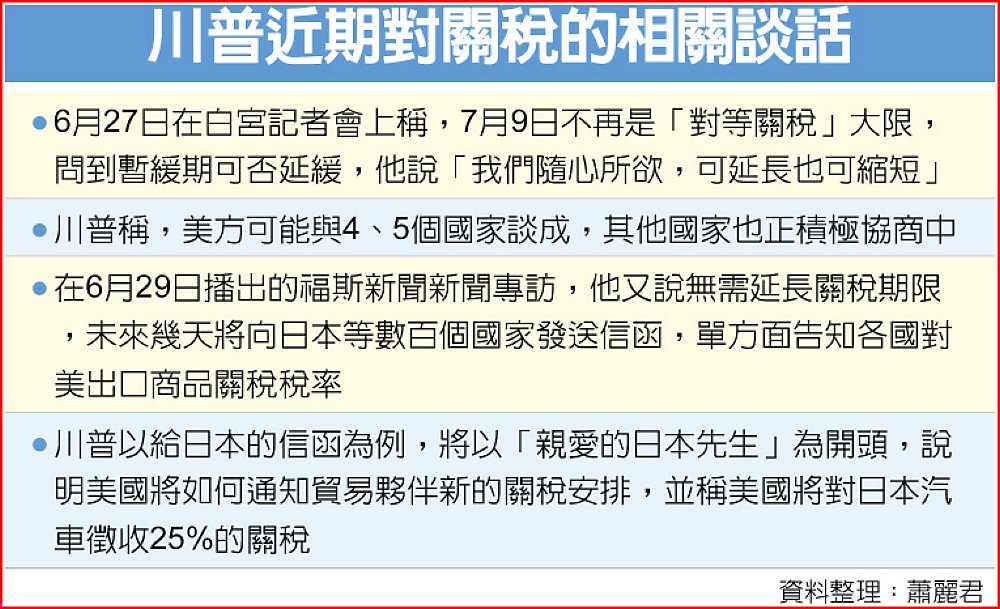 在7月9日大限截止之前的最後數天,各國領袖正大力遊說川普,紛紛派代表團前往華府。據美國財經媒體6月30日報導,知情人士表示,美國接近與台灣、印尼達成協議,與越南、韓國也可能談成。報導並未提供進一步細節,但又指出,包括日本、印度及歐盟在內的若干貿易夥伴,擔心美方未來還會針對晶片、藥品及商用飛機等課徵高關稅,因此不願簽署協議。