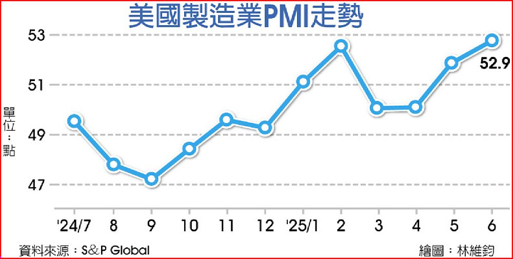 標普全球最新報告顯示,美國6月份製造業PMI終值由5月的52上升至52.9,創下2022年5月以來新高,並優於市場預期,連續六個月位在景氣榮枯分水嶺50之上,顯示製造業活動維持穩定擴張。標普首席經濟學家威廉森表示,製造業產出出現三個月首見成長,且國內和海外需求好轉,推動新訂單連續六個月增加。