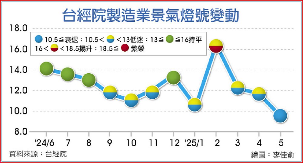 台灣經濟研究院1日發布5月製造業景氣概況,製造業景氣信號值連三個月下跌至9.88分,單月再減1.98分,5月製造業景氣燈號值明顯低於4月,景氣燈號由代表景氣低迷的黃藍燈直接轉為代表衰退的藍燈,為2024年2月、15個月以來再度閃藍,台灣經濟研究院分析:「主因為新台幣大幅升值所致!」