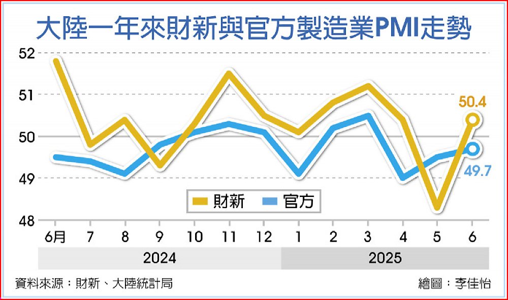 財新網1日指出,受美國大幅加徵中國產品關稅影響,財新5月份製造業PMI為48.3,為2024年10月以來首度跌落收縮區間。經過5月短暫緊縮,6月重返擴張區間則是中美關稅戰緩和後帶來的積極影響。