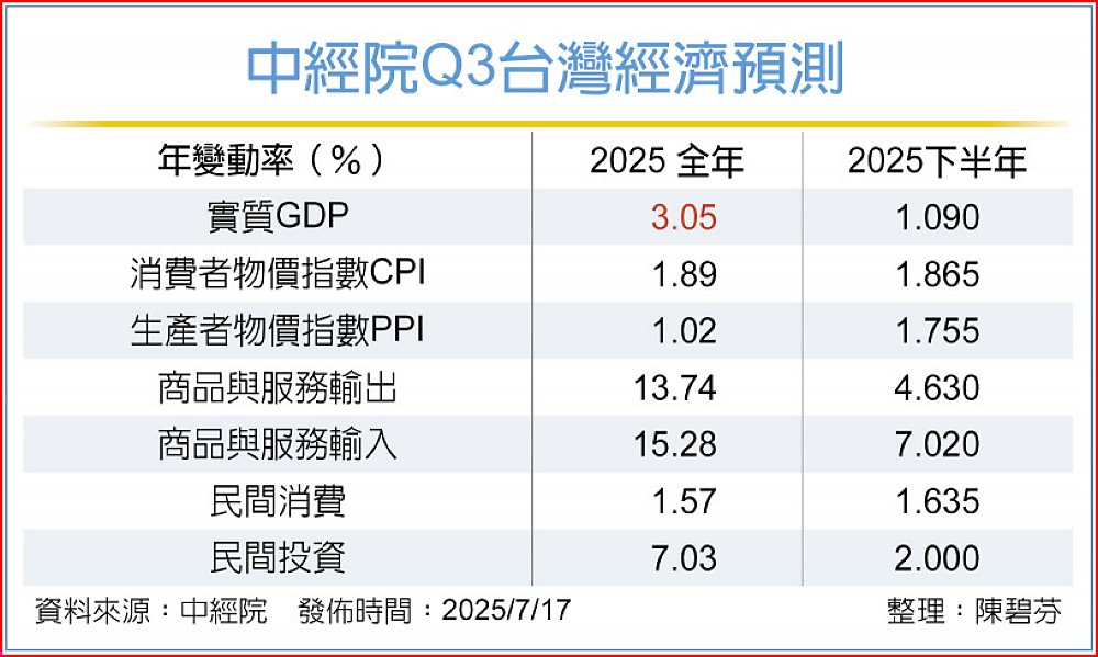 中華經濟研究院17日公布今年第3季台灣經濟預測,由於基期因素以及關稅政策等,預計今年下半年成長趨緩,第3、4季成長率分別為1.52%、0.66%;即今年成長趨勢由第1季破5%,逐季下行至第4季低於1.0%,全年經濟成長率約為3.05%,重新確定今年經濟成長率可以勉強保三,略低於今年初估測的3.22%,仍高於第2季估測最樂觀的2.85%。