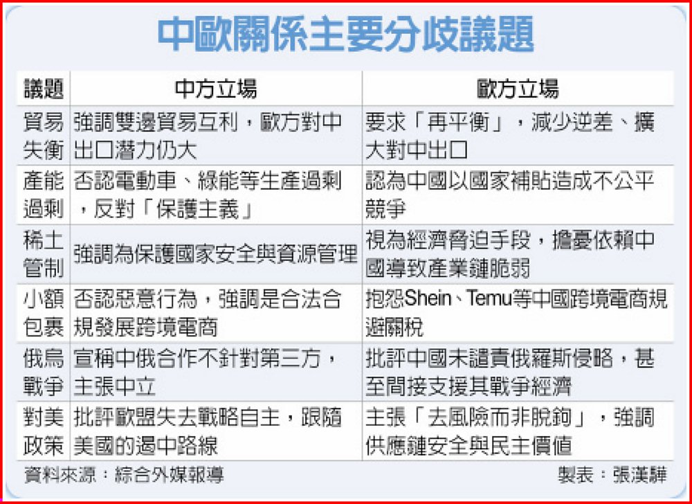 本次峰會登場前夕,歐盟表示將在中歐峰會期間,就稀土出口管制與烏克蘭戰爭這兩大極為關鍵的議題,向中國領導人施壓。