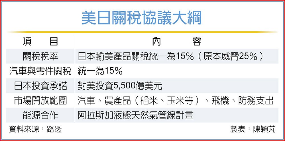 綜合外媒報導,日本與美國上周談成的關稅協議包含一項價值5,500億美元的對美投資計畫,內容涵蓋股權、貸款及保證等形式,相對的,美方將對日本出口產品調降部分關稅。赤澤接受NHK專訪時指出,日本、美國與其他理念相近國家正共同努力,建立涵蓋關鍵技術的安全供應鏈體系,這筆5,500億美元的投資計畫正是該戰略的一環。