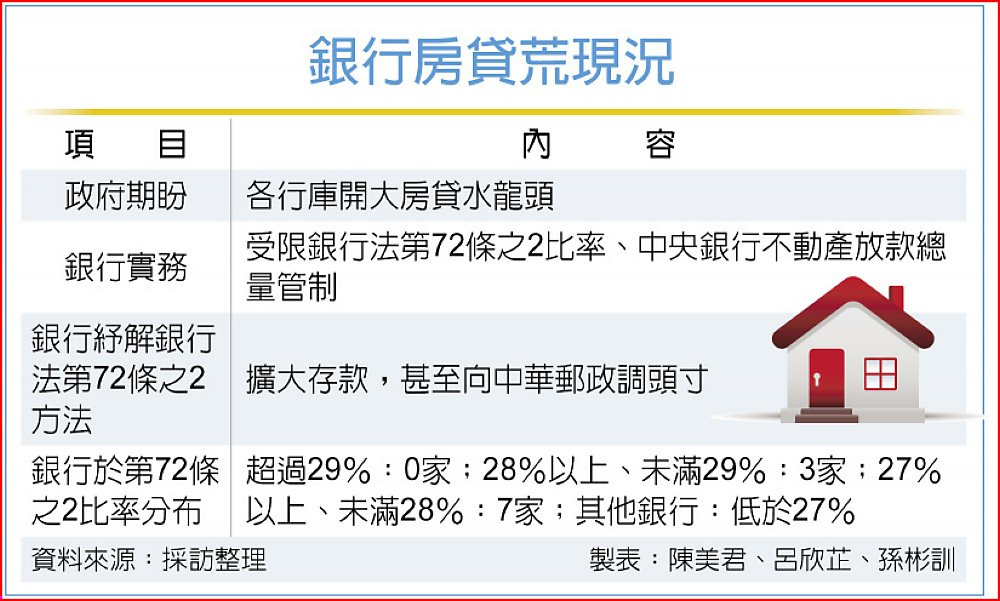 銀行法第72條之2比率的住宅建築及企業建築放款比重3成,及中央銀行要求降低不動產集中度,銀行在這兩項夾擊下,想放大房貸水龍頭成難題,現階段解方唯有政策開放的一念之間,不是金管會對72-2「政策性排除」,或中央銀行9月第三季理監事會議放寬不動產集中度控管、甚至排除特定計算,否則就算銀行積極擴大存款分母,也只能稍解困境,說不上放大水龍頭。