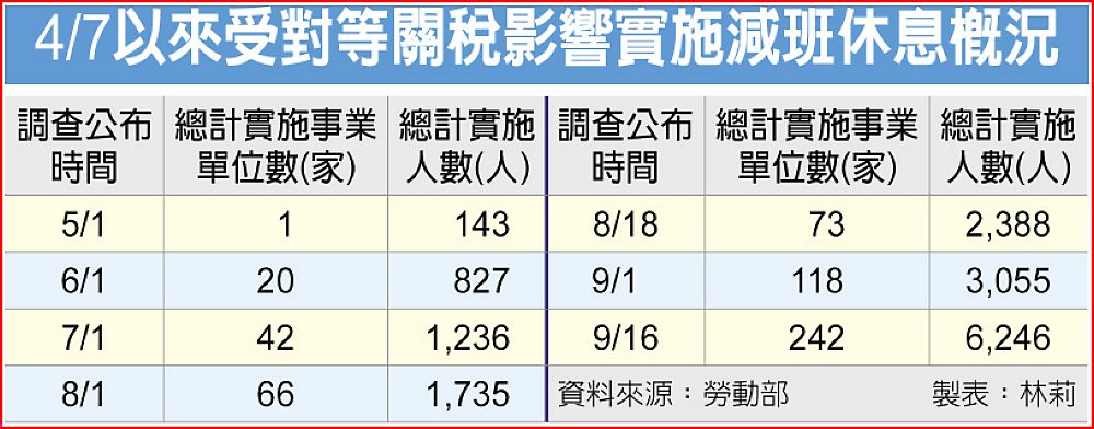 關稅效應持續擴大,勞動部16日公布最新減班休息統計,本期共有333家企業通報、影響人數7,334人,其中,受對等關稅衝擊的企業為242家,人數6,246人,較上期通報的3,055人暴增3,191人。勞動部指出,製造業受創最深,尤以金屬機電工業中的「機械設備製造業」為重災區。