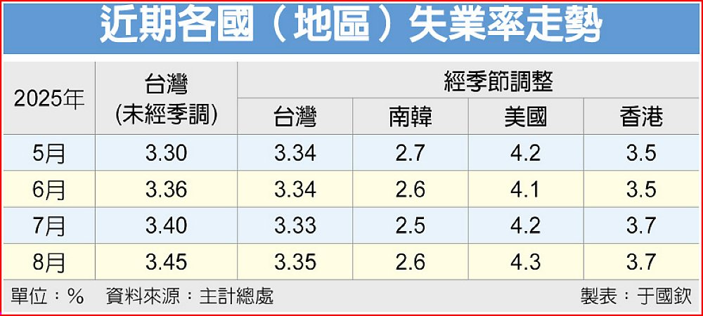 經季節調整後的失業率,除台灣上揚,南韓也由7月2.5%升至8月2.6%,香港8月雖持平在3.7%,但已比6月3.5%明顯升高,至於美國也由6月4.1%升至8月的4.3%。對等關稅除了衝擊台灣就業市場,多數國家甚至連美國自己勞動市場,也同受波及。