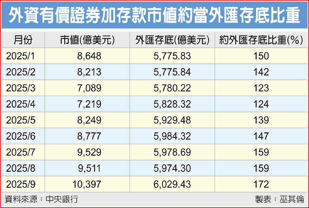 蔡烱民強調,美國9月降息後,提振科技股表現,台股與美國科技股連動性高,9月下旬至今台股不斷在創新高,帶動新台幣升值。觀察外資9月買超台股近新台幣2,000億元,整體呈現淨匯入,至月底外資持有國內股票及債券按當日市價計算,連同新台幣存款餘額已破兆元大關,來到10,397億美元,約當外匯存底比重則持平為172%,餘額及比重雙創史上新高。