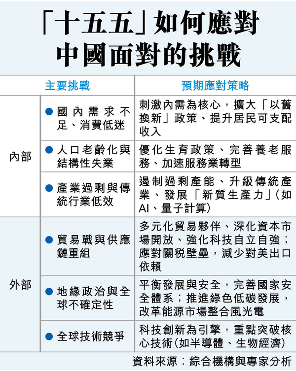 中國經濟目前面臨的內部挑戰主要包括國內需求不足、消費疲軟、房地產市場低迷、人口老齡化加劇,以及產業過剩產能問題;外部挑戰則涉及中美貿易戰升級、地緣政治風險、全球供應鏈重組以及保護主義抬頭。這些因素直接導致經濟增長放緩,成為中國2035年「全面建成社會主義現代化強國」的「攔路虎」。如何解決上述問題,應該就是「十五五規劃」制定的鑰匙所在。