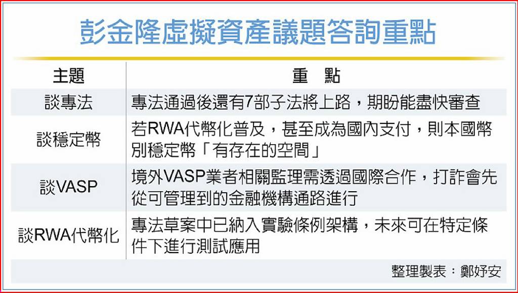 美國那斯達克今年9月向監管機構申請啟動代幣化交易,針對台灣是否跟進股票、債券代幣化開放議題。彭金隆回應,虛擬資產專法草案中已保留實驗條例的適用空間,未來可視國際經驗與監理發展彈性調整,全球都在思考RWA應用面,金管會將持續觀察各國會如何運用再進行評估。