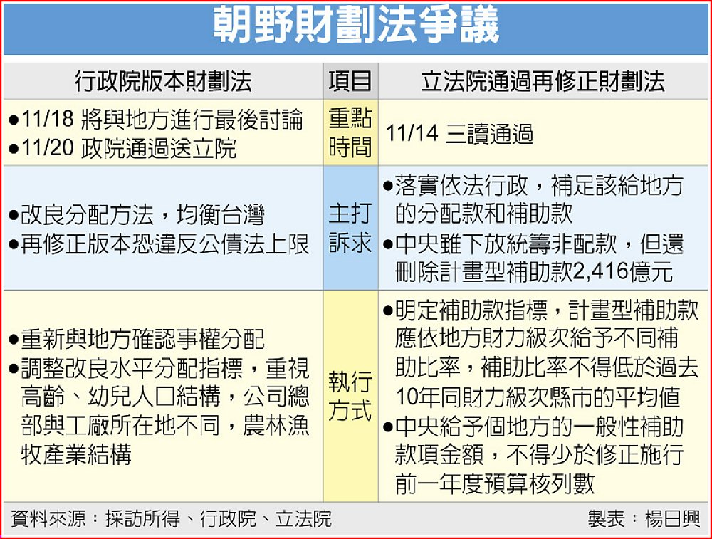 財劃法爭議再度在立法院爆發激烈爭辯,立法院14日三讀通過《財政收支劃分法》修正案,明訂中央對地方一般性補助款,不得少於前一年度。另計畫型補助款補助比率,不得低於過去10年平均值。