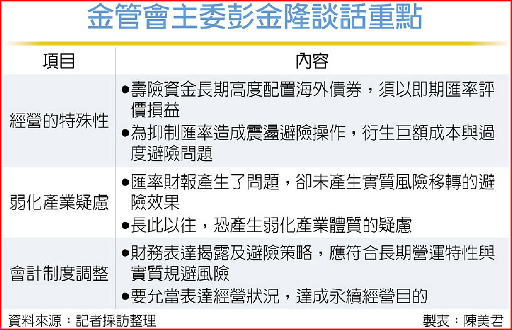 金管會主委彭金隆26日指出,台灣壽險業是「特殊中的特殊」,因歷史因素,壽險資金長期高度配置海外債券,依國際會計準則須以即期匯率評價損益,為抑制匯率造成的帳面震盪,業者透過大量避險操作因應,衍生出巨額避險成本與「過度避險」問題。