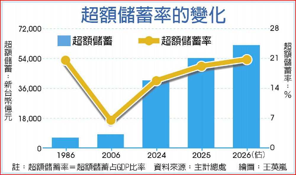 值得注意的是,這些年超額儲蓄雖屢創新高,但超額儲蓄率(超額儲蓄占GDP)卻從未打破歷史新高紀錄,但依主計總處預測,明年將會升至20.76%,一舉超越1986年的20.65%,改寫歷史新高紀錄。