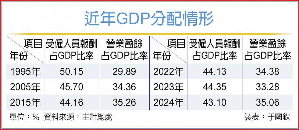 主計總處官員表示,從整體看,受僱人員報酬近十年成長率相對是低了一點,確實有分配上的問題。不過,讓這個比率從1990年代的50%降至2024年的43.1%,確實有部分原因是我產業從勞力密集轉向資本、技術密集所致,2024年這個比率創新低,確實值得注意。
