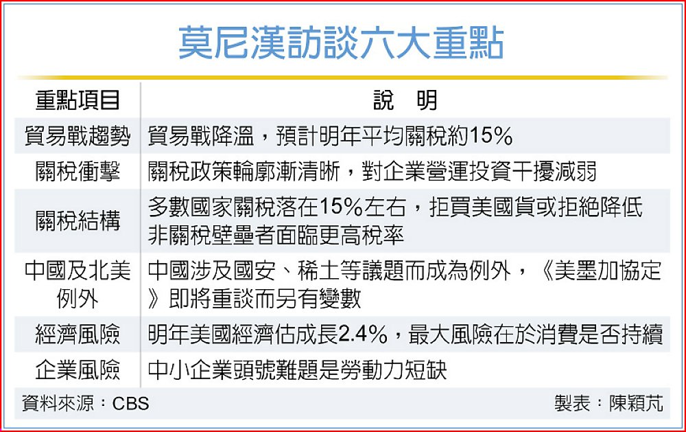 美國銀行執行長莫尼漢(Brian Moynihan)日前接受CBS電視台專訪時表示,在歷經一年關稅政策造成的市場震盪後,川普貿易戰逐漸出現「降溫」跡象,預期明年美國平均關稅水平收斂至15%左右,不確定性明顯降低,將有助企業重新調整投資與營運決策。