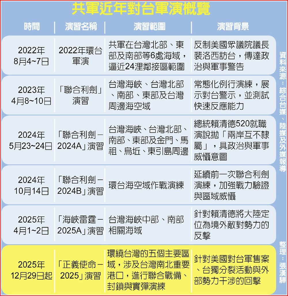 2022年8月,美眾議院議長裴洛西訪台以來,共軍七度環台軍演,本次是在日本首相高市早苗提出「台灣有事」論引發中日外交衝突,及川普政府同意111億美元的對台軍售後展開。