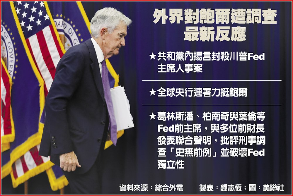 美國聯準會(Fed)主席鮑爾遭司法部刑事調查後,引發共和黨內部強烈反彈,黨內多位參議員揚言封殺川普的Fed主席人事案,多位Fed前主席發表聯合聲明痛批此調查破壞Fed獨立性,各國央行也連署力挺鮑爾,令調查風波愈演愈烈。