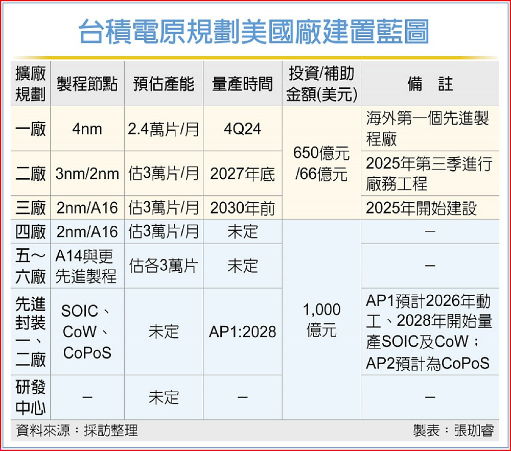 台積電(2330)目前已拍板在美國投資1,650億美元,當中的1,000億美元是在去年3月追加,預計在亞利桑那州建設六座先進晶圓廠、兩座先進技術廠及一座大型研發中心。