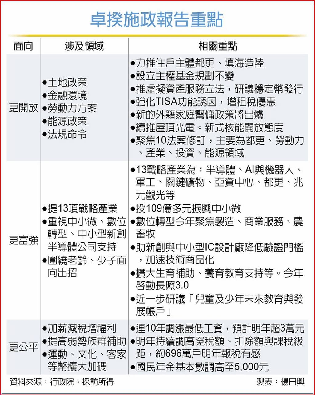 對其他面向,卓榮泰提及,包括中小微、數位轉型、老齡化相關的長照3.0與醫藥、少子化相關的生養教育相關政策,均是施政重點。