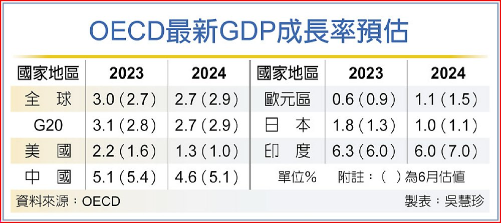 OECD在主要經濟體GDP預測更新報告,雖將2023年全球經濟成長率,由6月估值2.7%上修到3%,但較去年的3.3%明顯放緩。至於2024年全球成長率,OECD自6月估值2.9%下修為2.7%。