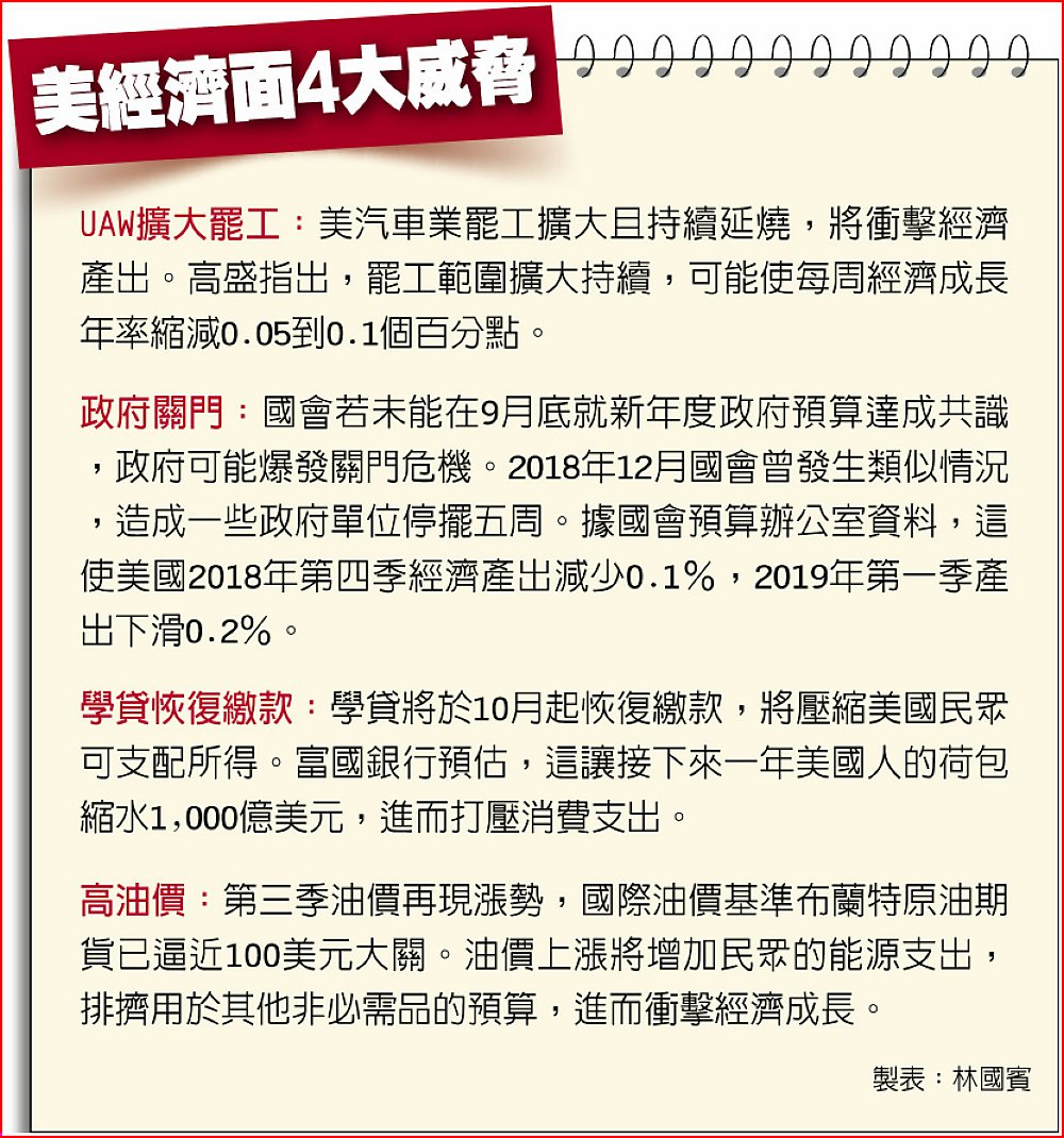 美國經濟今年成功度過一些亂流,但到秋季卻有四大威脅同時現身,可能對經濟造成更大動盪,這些威脅分別是汽車業罷工擴大、政府可能關門、學貸恢復償還與逼近3位數的高油價。