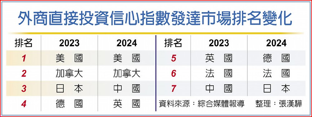 今年的榜單中,發達市場仍是FDI的重點對象,在榜單前25名中占了17個,其中,美國連續第12年蟬聯榜首,加拿大再度拿下第二名,英國上升一位至第四位,德國下降一位至第五位,法國繼續保持在第六位。日本因持續欲振乏力,2023年第四季陷入衰退,排名從第三位跌至第七位。
