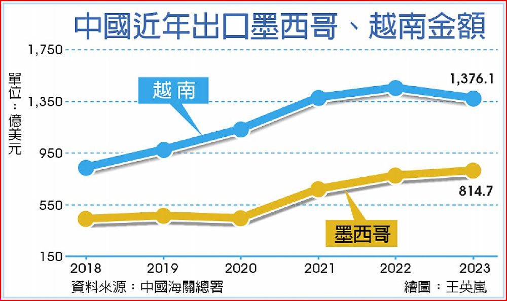 韓國朝鮮日報7日報導,韓國貿易協會國際貿易通商研究院近日發表「中國對美迂迴出口趨勢分析」報告顯示,過去四年,中國經墨西哥的對美出口額從2018年的53億美元增加至2022年的105.5億美元,幾乎翻倍。同期經越南的迂迴出口額也從15.7億美元增加至30.2億美元。