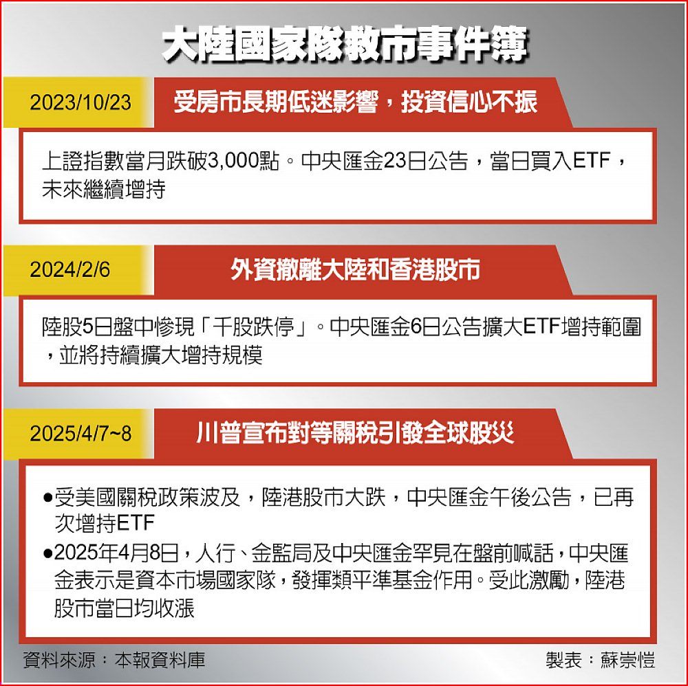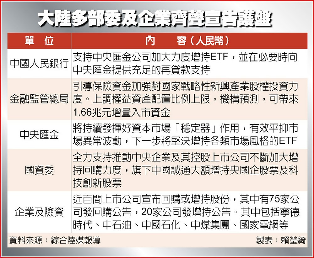 大陸「央媽」率中央匯金、金監總局罕見地在昨日開盤前發聲,中央匯金繼7日盤中表示已再次增持ETF後,8日再發公告,其為資本市場「國家隊」,發揮著類「平準基金」作用,又指將堅定增持各類市場風格ETF。人行同日表示,堅定支持中央匯金擴大力道增持ETF。中國金監總局則發通知,上調保險資金權益類資產監管比例上限上調5%。
