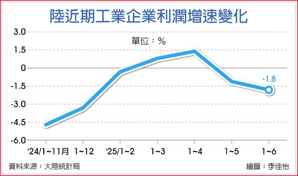 大陸統計局27日最新數據顯示,2025年上半年,全國規模以上工業企業實現利潤總額人民幣(下同)3.44兆元,年減1.8%,降幅較前五月擴大0.7個百分點。其中,國企利潤年減7.6%,降幅明顯高於整體水準,成為拖累整體工業利潤表現的主因之一。