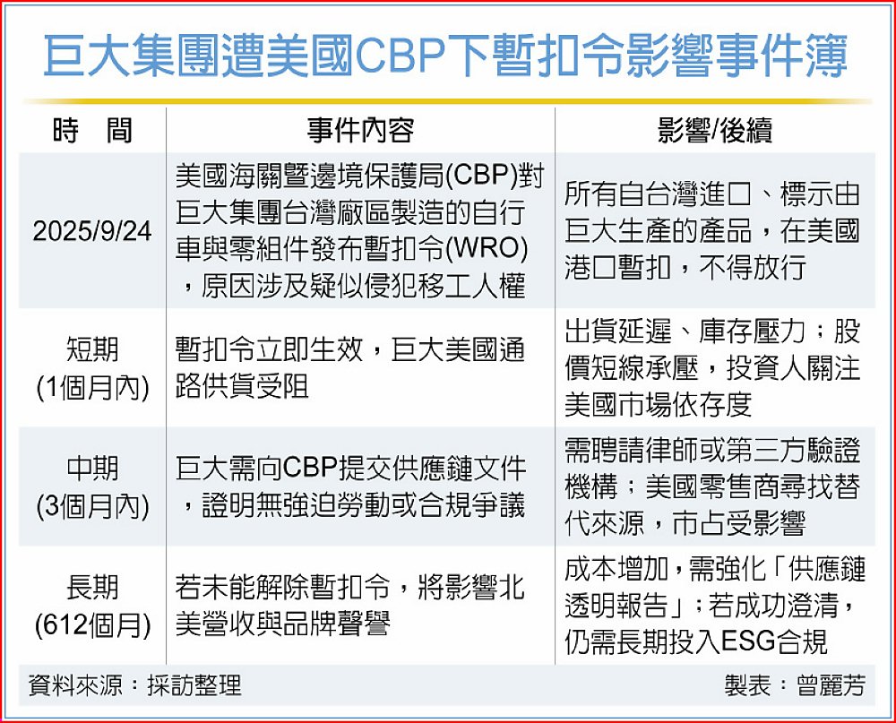 法人分析指出,此次事件,讓巨大集團短期面臨三大經營風險,一是營收衝擊:此次遭CBP發布暫扣令,正好發生在歐美傳統銷售旺季前夕,若暫扣令時間拉長,恐對第四季出貨與營收造成不小衝擊。二是品牌信任:此事件不僅影響巨大,也牽動國際品牌對台灣供應鏈的觀感,若未能妥善處理,恐導致訂單轉向;三是合規成本:即使事件最終解除,未來巨大及整個產業鏈勢必投入更多人力與資金於勞權治理與合規制度,成本將顯著增加。